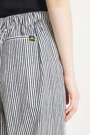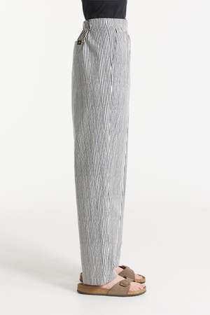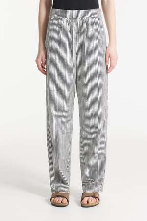 Pavin is a casual pant with an elasticated waistband, made from lightweight navy blue and white striped poplin. It features functional side pockets and a cool, comfortable fabric ideal for summer wear.