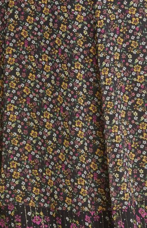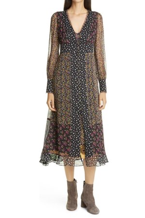 Acres of prairie style breeze through this mixed ditsy print dress, cut from airy chiffon and shot through with the shine of shimmery metallic thread.