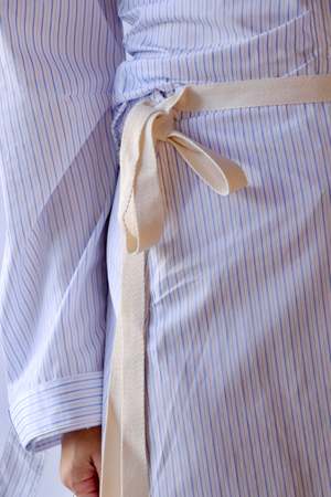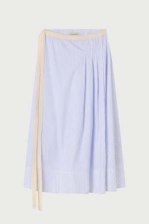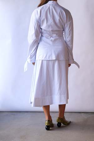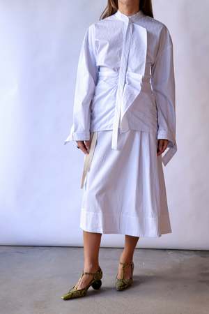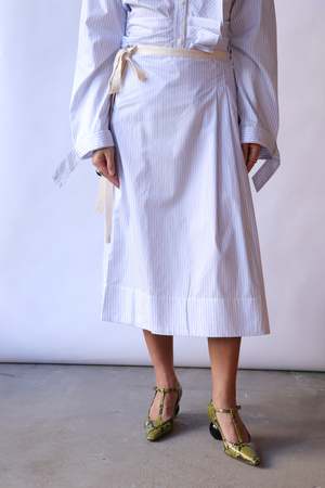 This asymmetrical pleated skirt features a waist tie and a concealed side zipper for a seamless fit. Designed to fall just above the knee, it offers a flattering and comfortable silhouette. 100% Cotton Hand wash or dry clean.