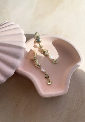 Close-fitting brass hoops style that hug the ear and dangle quirky spiral and crescent moon charms in brass and freshwater pearls. Charms are hollowed out in back to allow for a surprisingly lightweight fee. Sterling silver post and butterfly backing for additional stability. Earrings are 2 5 / 8" in height. Brass earrings with freshwater pearls, sterling silver post and butterfly backing. Handmade in Los Angeles