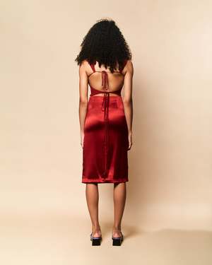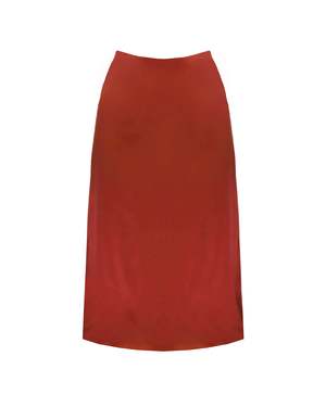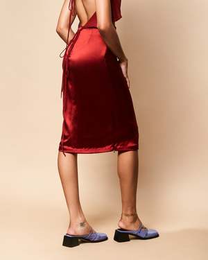 The Toni skirt is designed with a figure-flattering cut that falls just above the knees. Shown in silk crepe, the skirt features a concealed side zipper for an optional deep slit. Available in three sophisticated hues: black, moss, and chili.