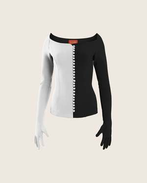The Josephine top is a form-fitting stretch top shaped by corset seams and two dozen covered buttons that line the front. This ultra-glam top features attached gloves and a boatneck for a sensuous effect. Shown in black and champagne, and also available in chili. Cut from jersey crepe for supreme comfort and ease of movement.