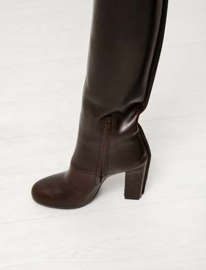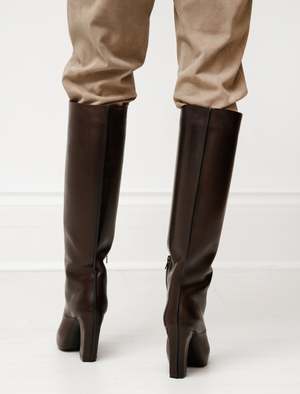 Lemaire never fails at achieving a certain level of seamlessness in the overall design and execution of their accessories, these boots are no exception. The upper is crafted from a single piece of vegetable-tanned leather which ascends to cover the entire heel, met with a fine seam that joins to the toe box and goes nearly unnoticed. A clean reverse seam boasts a painted edge that lines the entire 'spine' of the boot for a modern finish. In midnight brown undisturbed by any hardware or branding these boots command attention, exuding confidence and grace that is felt from afar. - Made in Italy - 100% cow leather - Concealed front platform, 10cm heel