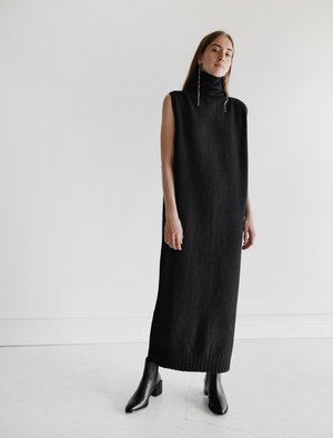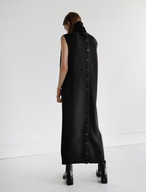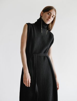 A long line wool dress with buttons down the back, this dress has many options for wear. Wear the buttons in the front, wear it open as a vest, open the top buttons to create a large collar that drapes over the shoulders, wear it belted.. it goes on! Kiss those winter doldrums away. - Made in Romania - 100% wool - Dry clean - Sophie is 5'8"; bust 32"; waist 24"; hips 34.5"; wears a size small