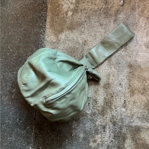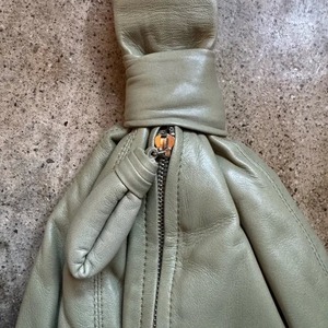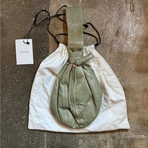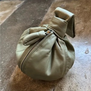 Lemaire Ball Purse Sage/Khaki - brand new Original duster bag and tag. - Knotted loop top handle - Vertical silver tone covered metal zipper closure - Leather wrapped zipper pull - Tonal topstiching - Canvas lining with interior leather logo2 - Can be worn in hand, as wristlet, or at elbow - Available in black and brown, sold separately - 100% Leather, 100% Cotton lining - Measures 7"L x 9"H x 7"D; 6.5" handle drop. - Made in Spain