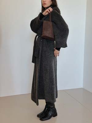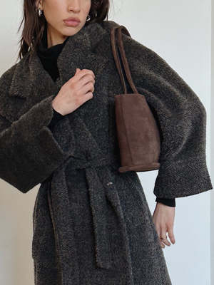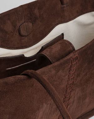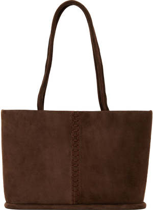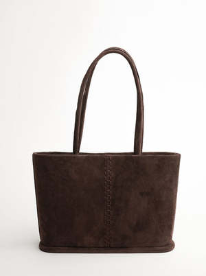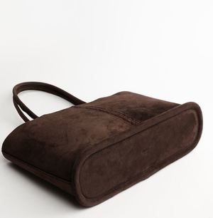 Suede dark brown medium shopper shoulder bag featuring twin rolled carry handles, piping at base, magnetic closure and flat base design. Logo embossed at face. - Two patch pockets at interior - Cotton twill lining - 8" x 13" x 3.5" - 100% Cow Leather - Lining: 100% Cotton - Made in South Korea
