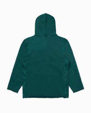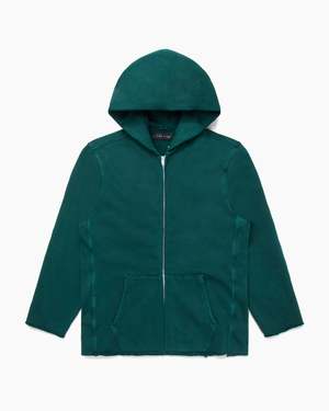 Les Tien's washed emerald green Raw Zip Hoodie features a vintage brushed texture and is laundered, pre-shrunk, and garment dyed. With reverse outer stitching cuff details, gold-plated Cobrax grommets, and a front Riri zipper closure, this hoodie also includes split front kangaroo pockets and a raw edge finish.