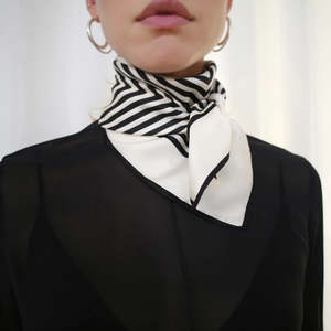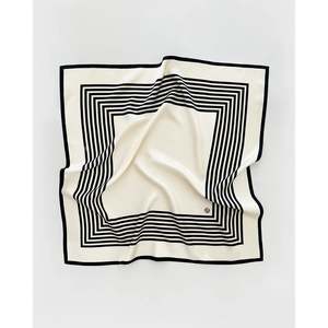 Our first and most classic design, launched in 2018. This scarf comes in a medium size of 65 x 65 cm, designed to be worn in a variety of ways. Wrap it once or twice around your neck, wear it around your waist, or loop it through a high ponytail. COLOR Cream & Black FABRIC 100% Silk CARE Dry clean only. Steam or iron gently. SIZE 65 x 65 cm