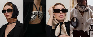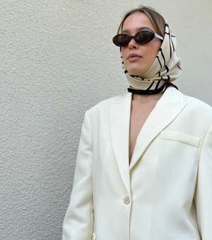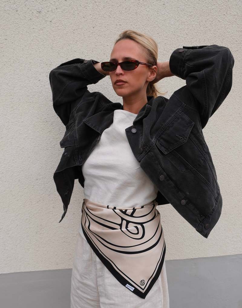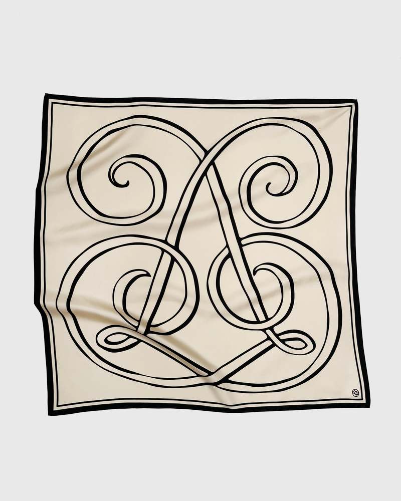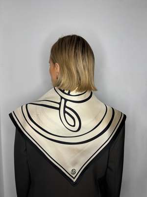 This timeless, classy silk scarf from lescarf is designed to be worn year-round with all kinds of garments. There are endless ways to style it: drape it around your neck, tie it in your hair, hang it on your bag, or wear it around your head. The scarf features a sand and black monogram print. Fabric: 100% Silk Care: Dry clean only. Steam or iron gently. Measurements: 80 cm x 80 cm Country of Origin: China.