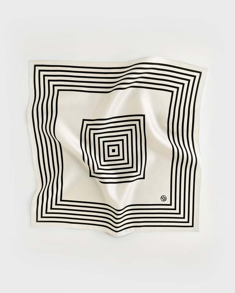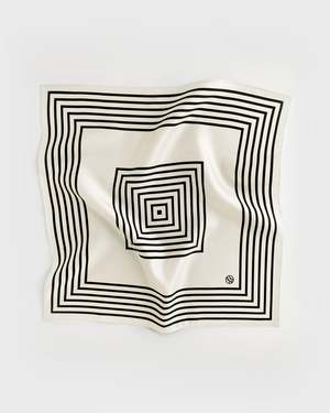 Exclusive scarves by lescarf are timeless, classy, and designed to work all year round with all kinds of garments. There are endless ways to style lescarf: drape the scarf around your neck, tie it in your hair, hang it on your bag, or wear it around your head. This silk scarf is 50 cm x 50 cm in size and features a cream and black geometric print. Fabric: 100% Silk Dry clean only Steam or iron gently Country of Origin: China Measurements: 50 cm x 50 cm