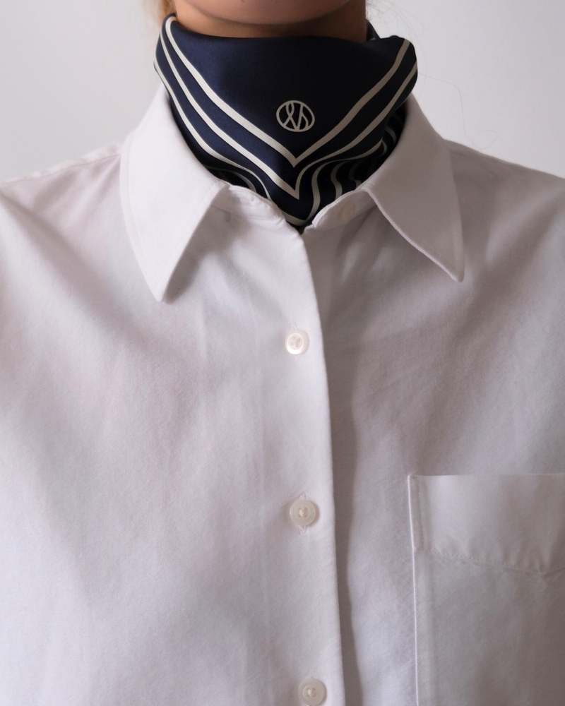 Exclusive scarves by lescarf are timeless, classy, and versatile pieces that work all year round with all kinds of garments. There are endless ways to style lescarf: drape the scarves around your neck, tie them in your hair, hang them on your bag, or wear them around your head. This silk scarf is 50 cm x 50 cm in size and features a navy and cream geometric print. Fabric: 100% Silk Dry clean only Steam or iron gently Country of Origin: China Measurements: 50 cm x 50 cm Type: Scarves