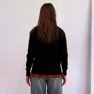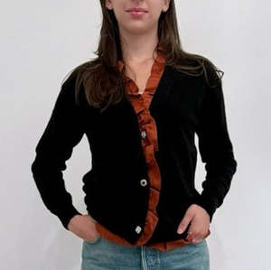 A cashmere stretch cardigan, spun in Japan with ruffles made of luxurious silk satin and buttons to accent the design. Stretch yarn is used to ensure durability and maintain the garment's shape over time. 94% Cashmere, 5% Nylon, 1% Polyurethane. Made in Japan. Sizing: 0=XS, 1=S, 2=M, 3=L.
