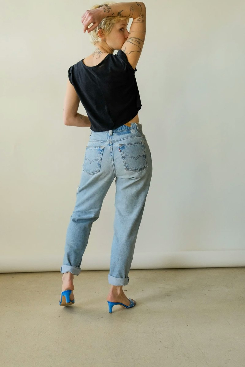 Perfectly soft and faded Levi's 512s. Distressed throughout with a high rise and tapered leg. Good for modern size 2-4. Fabric: Cotton Measurements: Waist 27 Rise 11 Hips 42 Inseam 28