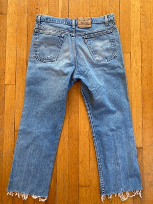 Vintage 1970s hand-patched cropped Levi's 517s. 517 is the same cut as the 501 but has a zip fly. Note that these are men's jeans and run narrow in the hips! Excellent vintage condition with a gorgeous patina of fades, abrasions, and patches. Raw hem. 100% cotton, made in U.S. ACTUAL FLAT MEASUREMENTS IN INCHES: W 17.5, HIP 20.5, RISE 13, INSEAM 26 36/32