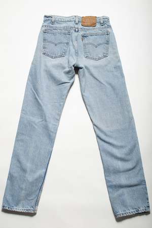 Vintage Levi's 505 denim jeans. Sits right at the natural waist with a straight leg. - 100% cotton - Zipper fly - Tag size: W30 L32 - Light wash - Note: Spot on front and wear on inner thigh. Approximate measurements: Waist: 28" Hip: 38" Rise: 11" Inseam: 30.5"