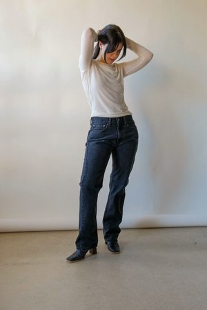 Mid-rise, straight leg jeans in a black wash. Front zip with button closure. Fabric: Cotton Measurements: Waist: 31"/32" Rise: 11" Hips: 44" Inseam: 34"