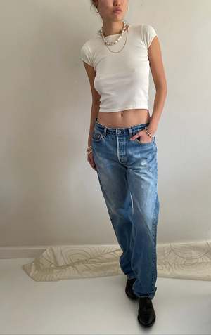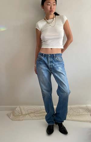 Vintage Levi's 501 jeans made in the USA featuring shrink-to-fit denim. These jeans showcase naturally faded light wash denim with light fray and faint bleach marks on the upper thigh. No major holes or stains are present. Measurements: Waist 32", Rise 11.75", Hips 45", Inseam 34", Flat at thigh 12", at ankle 8". Tagged size 35 x 38. Model is 5'10" and wears size 2/4.
