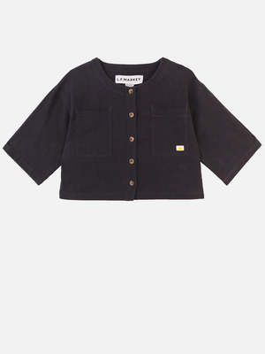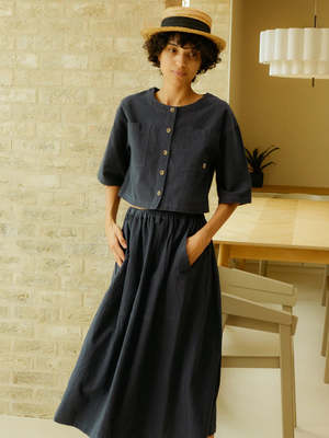 The Beau Textured Linen Top from L.F.Markey is a cropped, boxy top with a round neckline and imitation horn buttons down the front. It features wide mid-length sleeves, front patch pockets, and the brands mini sun woven patch logo2. Crafted from a textured navy cotton-linen blend in a dusty navy blue. - 95% Cotton, 5% Linen - Round neckline - Square cut - Wide mid-length sleeves - Front patch pockets - Sun woven patch logo2 - Navy - Machine wash on a cold gentle cycle with similar colours.
