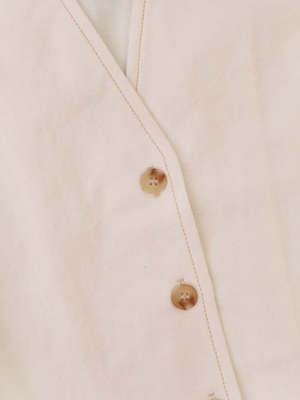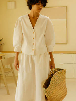 The Lowry Textured Cotton Top from L.F.Markey is a fitted top with a V-neckline and tortoiseshell button fastening down the front, with pleated and gathered detailing on the sleeves enhancing their voluminous shape. It features contrast utility topstitching and is crafted from a textured ecru cotton. Beautiful paired with the L.F.Markey Emile Skirt in Ecru. - 100% Cotton - Feminine silhouette - Voluminous sleeves - Structural shape - Machine wash on a cold gentle cycle with similar colours - Model is 57 / 172 cm and is wearing a size UK 8 - Worn with Emile Skirt
