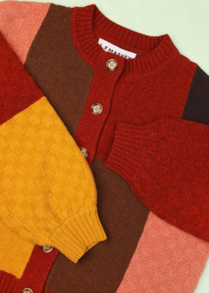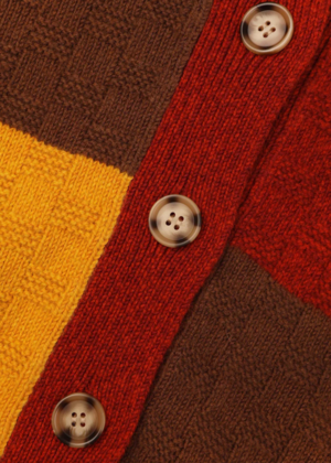 Patchwork cardigan with a crew neck, dropped shoulders, voluminous sleeves, imitation horn buttons, and ribbed hem and cuffs. Mid-hip length. Fabric: 50% cotton, 50% wool. Size notes: - XS: Bust 116 cm, Hem 100 cm, Length 54 cm, Sleeve length 49 cm - S: Bust 122 cm, Hem 106 cm, Length 56 cm, Sleeve length 50 cm - M: Bust 128 cm, Hem 112 cm, Length 58 cm, Sleeve length 51 cm - L: Bust 134 cm, Hem 118 cm, Length 60 cm, Sleeve length 52 cm Care: Dry clean or hand wash only. Made in China.