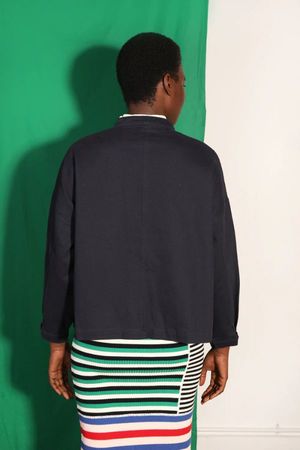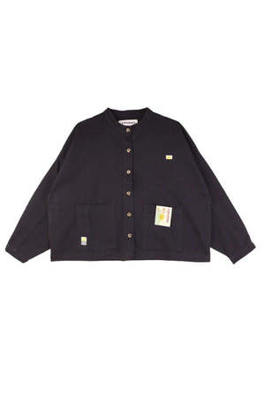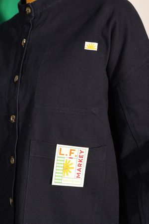 L.F. Markey's take on a classic chore coat with a wide boxy shape, voluminous sleeves, and imitation horn buttons down the front. Features side seam pockets, front patch pockets, and a large removable cardboard label on the left pocket. Made from classic navy cotton drill with signature sun and wave woven patch logo2s throughout. DETAILS: - 100% Cotton - Chore Coat - Workwear - Cotton Drill - Utility Style - Care: Machine wash on a cold gentle cycle with similar colours. SIZE + FIT: - Models are wearing a size US4/UK 8 - For more sizing details, please refer to the measurements in the size guide below.