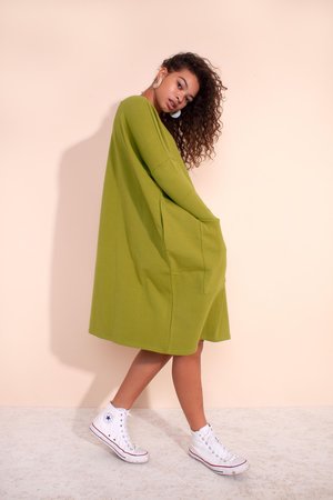 Mega oversized dress in cotton jersey. Large front pockets and slim long sleeves. 100% Cotton. Machine wash on a cool gentle cycle. This style is one size only. Model is 5'9" / 175 cm. Worn with Sundara Mar earrings.