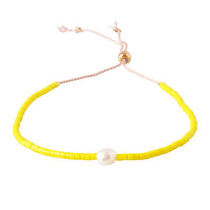 Delicate beaded bracelet featuring cultured freshwater pearl and glass seed beads on a durable blush silk cord. Fully adjustable from 5" to 9" and finished with gold-filled crimps that won't tarnish.