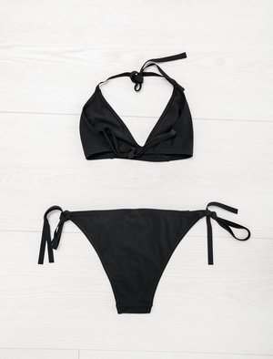 Diciassette is a a bikini that fastens with adjustable heat bonded ties on the back and the sides of the hips. It has hoops at the end of the collar straps that allow the bikini to be fastened both behind the neck and behind the back. Lined. - Made in Italy - 68% polyamide, 32% elastane - Hand wash