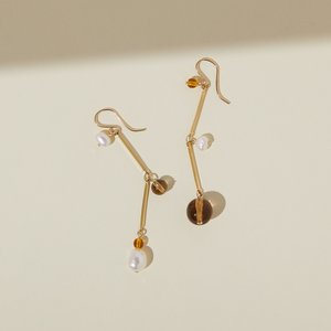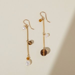Fte means celebration and these earrings will be the hit of all your parties. Sophisticated yet playful, the freeform pearls and translucent glass dangle from modern bar chain. The slightly asymmetrical layout warrants a double take. gold-filled hear hooks gold plated brass chain czech glass freeform pearls 2" long lightweight