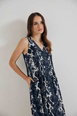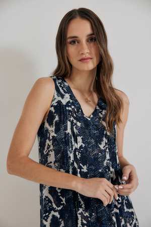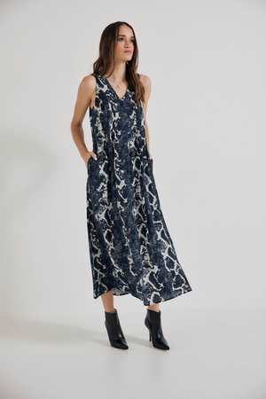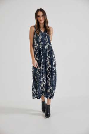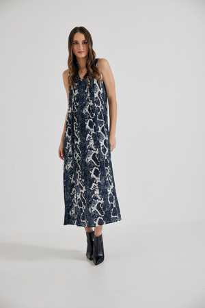 The Maxi Dress in Blue Python Silk by Lindsay Nicholas New York features a bold animal print in a striking blue python pattern. Crafted from 100% silk crepe-de-Chine, this lightweight, breathable, and wrinkle-resistant dress offers effortless elegance from day to night. The design includes a pin-tucked bodice for a structured yet flowing silhouette, French seams for a refined finish inside and out, a flattering V-neckline, and functional pockets. Made in Melbourne, Australia. Sizing: XS (US 0-2), S (US 4-6), M (US 8-10), L (US 12-14) Care: Dry Clean Only.