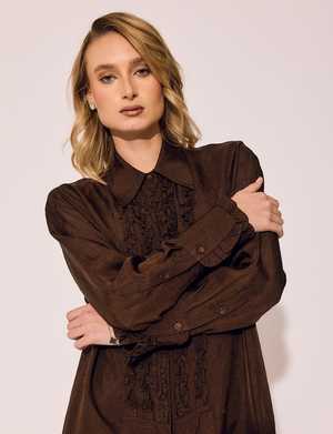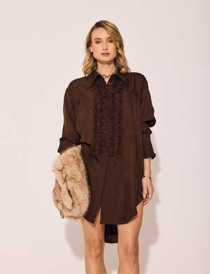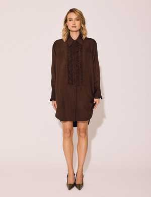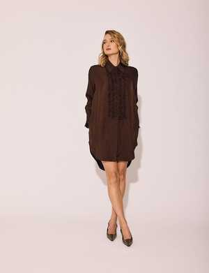 Decadent and unexpected, the Chocolate Tuxedo Shirt Dress brings warmth and sophistication to a classic silhouette. This piece whispers luxury rich, grounded, and quietly confident. Perfect for a candlelit dinner, an art gallery opening, or a chic weekend escape, this dress blurs the line between tailored and sensual. Features: Elegant frill detail along the front and cuffs Button front with covered placket Functional pockets Wear it as a dress, tunic, or unbuttoned as a light jacket Designed for comfort without compromise Fabric: 100% Acetate Fit: Slightly oversized; model Olivia is 58 and wearing a size Small Care: Dry clean only