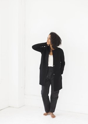 - Line Knitwear - Gilles in Caviar - Button up jacket - Hidden buttons - Side slit detail - Side pockets - Built in sweater cuffs - 95% Wool, 5% Nylon, Sleeve detail 100% Wool - Dry clean only