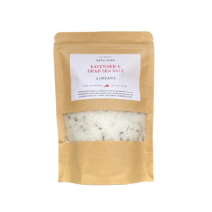 Relax with our all natural mineral bath soak. Made with dead sea salt, lavender flowers, and lavender essential oil. Net weight 16 oz Handcrafted in Richmond, Virginia