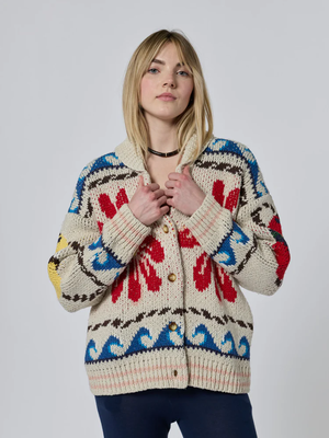 The Sloane Cardigan is an oversized cardigan crafted from 100% cotton and made in Peru. Inspired by vintage nautical sweaters, it features playful maritime motifs with daisies and buoys across the body, and multicolored racing ships illustrated along the back. Designed with a relaxed fit for easy layering, this cotton knit feels substantial, offering comfort, warmth, and visual interest. Balancing graphic charm with everyday wearability, it brings a lighthearted spirit to a timeless sweater silhouette. A distinctive layering piece that adds color, storytelling, and personality to everyday dressing. Fit & Sizing - Length: 25 1/4" - Bust: 44" - Sleeve length: 19 1/4" - Oversized fit Our model is 5'10", and is shown wearing a size Small.