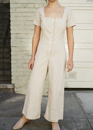 - Lisa Says Gah - Rita Jumpsuit in Natural - Squareneck button-down jumpsuit - 55% Linen 45% Cotton - Hand wash cold, lay flat to dry - Size Small measures: Length (from shoulder): 50" / Bust: 33" / Waist: 31" / Hips: 40" - Made in San Francisco