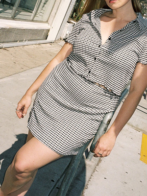 Textured gingham check mini skirt featuring a side slit and an elastic waist.