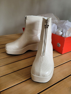 Chunky, retro-style 'goes-with-everything' platform boot; Features: 2" heel, synthetic white crocodile pattern, and custom Lisa Says Gah florette zipper; Fits closer to a 6 than the printed 6.5