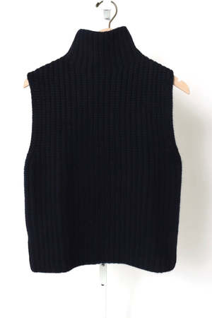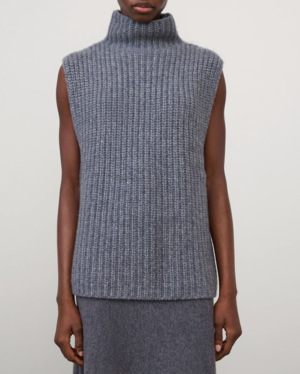A bold new addition, the Joceylne vest is crafted in chunky Paddington knit cashmere with a digitally printed yarn a specialist technique that creates a melange-like effect with an organic look and a depth of tone. The relaxed fit silhouette features a high-standing collar, a sleeveless design and a clean hem. Knit type: Paddington Rib Gauge: 3 Weight: 505g Composition: 100% cashmere The model is 179 cm / 5'10.5" tall and wears a size 1. Designed for a regular fit. Color: Navy (note: model is photographed in Mist).