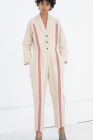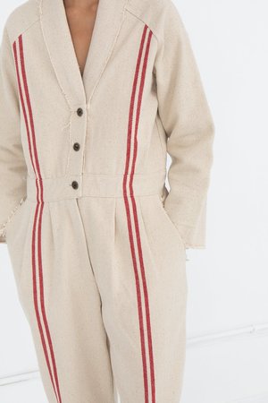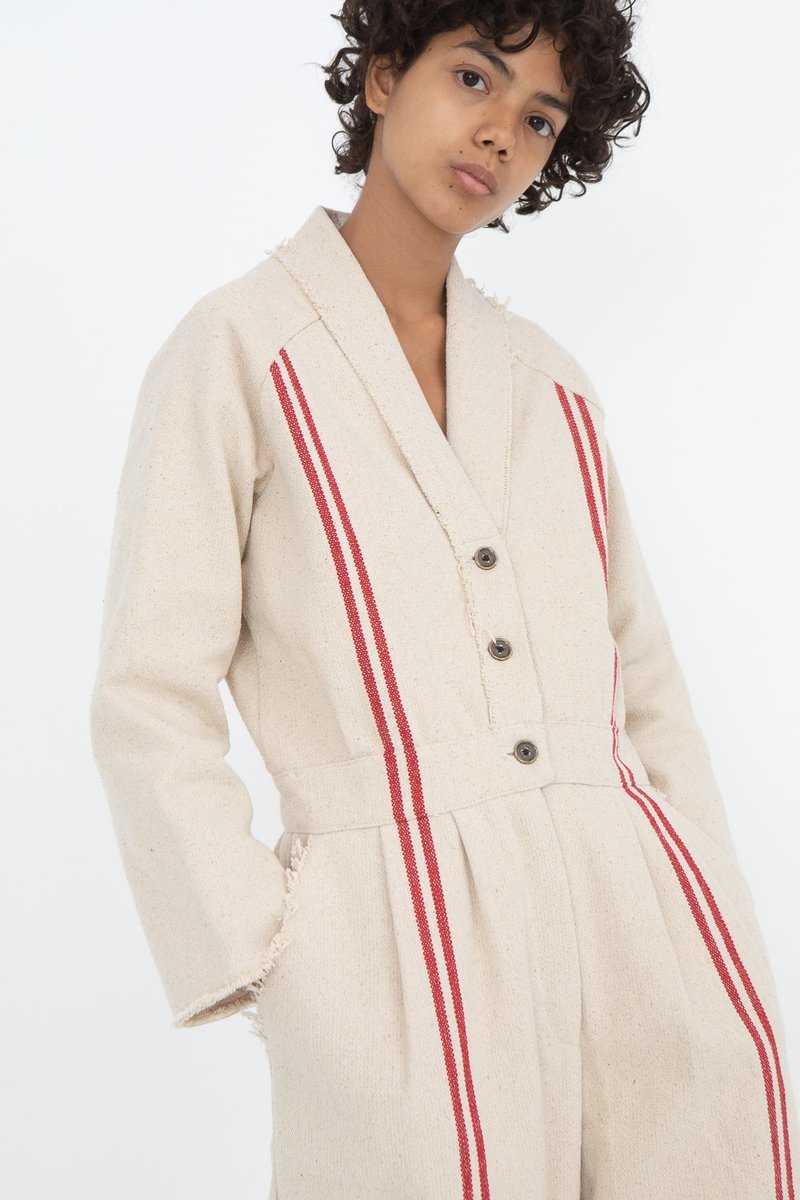 Long sleeve shawl collar jumpsuit in hessian cotton. Fixed waist with zip fly and three button closure. Side seam pockets. Raw edges. Color: Red Stripe Material: 100% Cotton Model is 5'9" and wears size S. Little Creative Factory follow a philosophy of slow manufacturing, producing unique pieces out of their workshop in Barcelona. Their playful and romantic designs pay homage to the carefully crafted clothes of days gone by, utilizing contemporary fabrics for classic designs with a modern twist. Building a company based on heart and soul combined with sustainable sourcing, LCF have a dream to dress the most creative of minds.