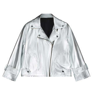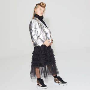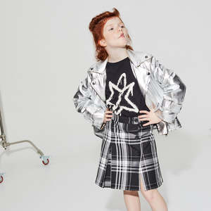 Little Creative Factory is a manufacturer of big dreams, committed to creating an experience that goes beyond the notion of getting dressed and helps kids develop their own personal expression and confidence. Crafting playful and timeless garments for kids and teens from their Barcelona hub, they source all materials locally and sustainably to create collectsions that are romantic with an edge of street style. - Metallic silver punk-inspired jacket - Side pockets - Slanted zip closure down the front - Long sleeves 78% Polyester, 22% Polyurethane / Lining: 100% Cotton / Padding: 100% Polyester Machine wash cold. Do not bleach, iron, dry clean or tumble dry.