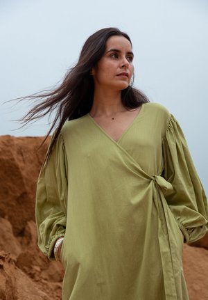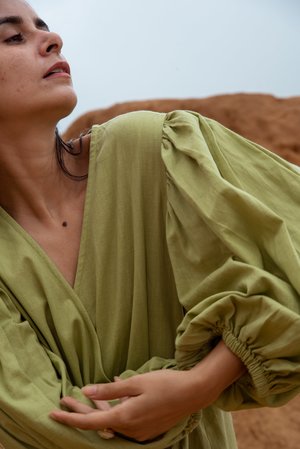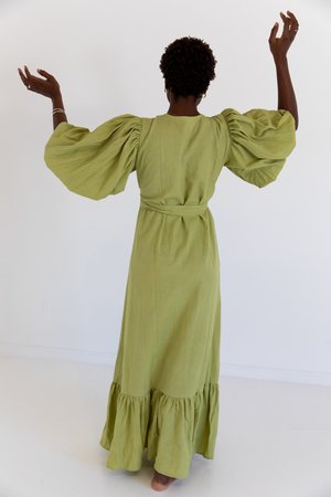 Bryce is our newest silhouette and gorgeous in this flax linen. A wrap dress that has glorious balloon sleeves and a modest neckline, also with pockets both sides. It is Maxi length and made in just two sizes due to the nature of how we created these pieces. Models are a petite size 8, wearing the XS/S. They are a heavenly fit for all shapes. (due to label issues some XS/S may have S/M though are the same garment fit) 100% Flax Linen Hand Dyed Designed in Australia and Made in India