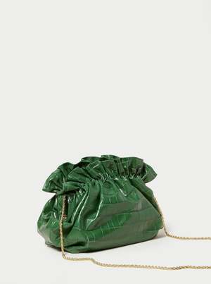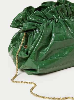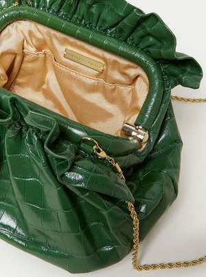 Willa Mini Pouch in Bottle Green by Loeffler Randall. Gathered mini frame clutch in bottle green croc-embossed leather. Features a removable twisted gold chain crossbody strap, frame closure, and full lining. - Dimension: W: 11.5 X D: 3 X H: 6.5 - 19.75" Drop - Materials: Shell: 100% Cow, Trim: 100% Metal - Care: for best results, avoid contact with water and restore with professional care seasonally.