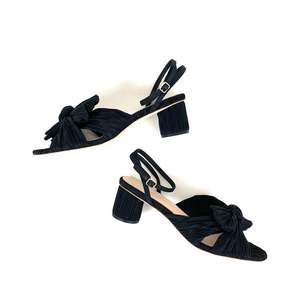 Pleated mid-heel sandal in black topped with the signature knotted bow. Features a padded footbed with gold stamped logo2. Open toe with adjustable buckle ankle strap. 2 inch heel. - Upper: 100% Polyester - Outsole: 100% Bovine Leather ALL SALE ITEMS ARE FINAL SALE!