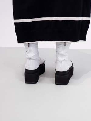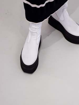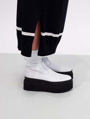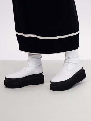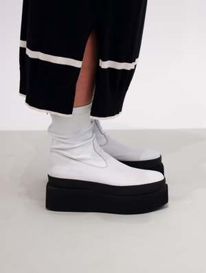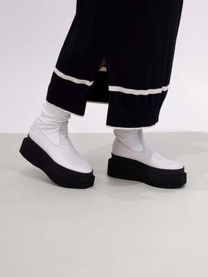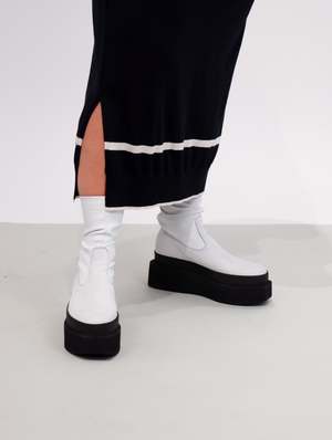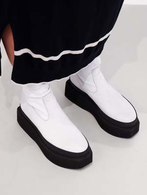 The Square Platform stretch boot is a modern and minimal boot, characterized by it's striking colorway. A greige/white leather upper features a tonal zip, with the whole boot being set upon a stark black platform sole. The sole is very geometric in design, and looks to travel up the upper of the shoe due to a matching black welting. If you don't have a white boot in your rotation, this one is for you. Designed in Denmark. Made in Italy. FIT & SIZING Platform height: 2.5 Take your true size. Traditional European to U.S. sizing 36 | 5.5-6 37 | 6.5-7 38 | 7.5-8 39 | 8.5-9 40 | 9.5-10 41 | 10-10.5 DETAILS Material | Upper: 100% Leather | Platform: Foam Color | GREIGE Designer | LOFINA CARE Any imperfections and discolorations are not defects, but the unique fingerprint of leather's natural beauty. With time, wear, sunlight, water, and love, your leather will change color and texture. Wipe clean with damp cloth and air dry.
