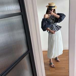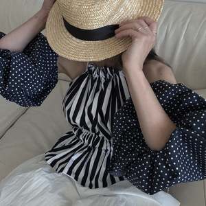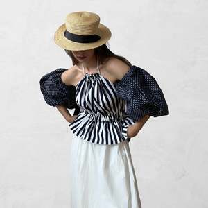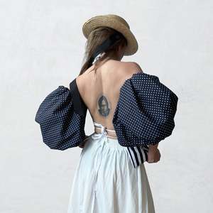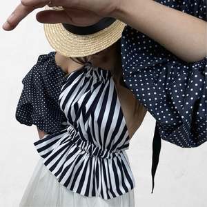 A fresh take on the classic striped top featuring a halter neckline and statement balloon sleeves. The double-layered design includes adjustable shirred ties and detachable sleeves for multiple styling options. Made with care in our London atelier. - Material: 100% cotton - Color: Navy and white stripe - Sizes: XS/S, M/L (Adjustable fit with tie system) - Features: Detachable balloon sleeves, shirred tie adjustment, double-layer construction - Style: Pairs with jeans, skirts, or shorts Stunning minimalist candy stripe halter ruffle. Made to order in our London atelier, available in other prints & colors. One size - can be tied to your size (perfect for XS to M). Cotton poplin fabric, dead stock coupons. Great piece for a minimalist look or as a pop of color.