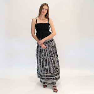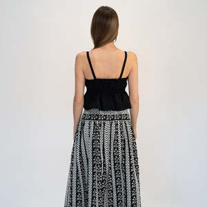 Spaghetti strap top with two rows of lace intarsia and bullionet embroidered details. The print comes from our archive and the fabric is made in Italy. All embroideries are made in Tuscany. Each piece is hand crafted by master artisans and may vary slightly from the image shown. Composition: 100% Cotton Fit: True to size; model is 57 and wears a size S.