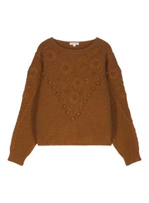 Vintage-inspired and redesigned with a bohemian flair, this sweater is a timeless must-have in your wardrobe. Available in a cinnamon tone on tone version, it's designed to be worn, worn again and again throughout winter. Details: Moss stitch sweater Handmade floral embroideries V-shaped pompoms Open neck This item was imagined by Marie Pidancet and her passionate team.