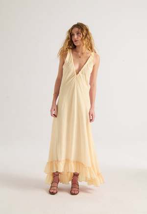 We're bringing back this classic and timeless Loup Charmant style from the archive. With adjustable drawstring tie straps, this sexy bias cut gown has a slight high-low hem and a raw edge bias cut ruffle at the hem. It's a great silhouette for different body types as the wide sweep and drawstring gathered neckline make it an extremely versatile piece. - Adjustable straps and neckline - Bias cut - Raw edge ruffle at hem - Signature cotton fabric This item is Final Sale.