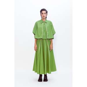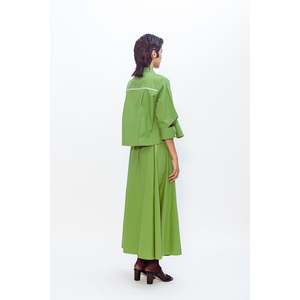 Structured green A-line midi skirt with subtle vertical striping for an elongated, tailored silhouette.