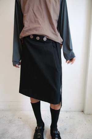 Wrap skirt with large mother of pearl buttons at the waist. 100% cotton twill. Made in New York City. LOVETHANKS, founded by Georgia Baltay in 2022, is a Brooklyn-based fashion project creating handcrafted clothing, objects, and accessories. Rooted in fine art and gratitude, each unique piece is made in New York City.